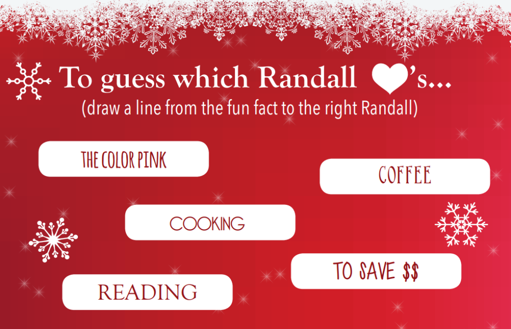 Norm – coffee; Stacey – reading; Danny – saving $$; Jacob – color pink; McKenzie – cooking.